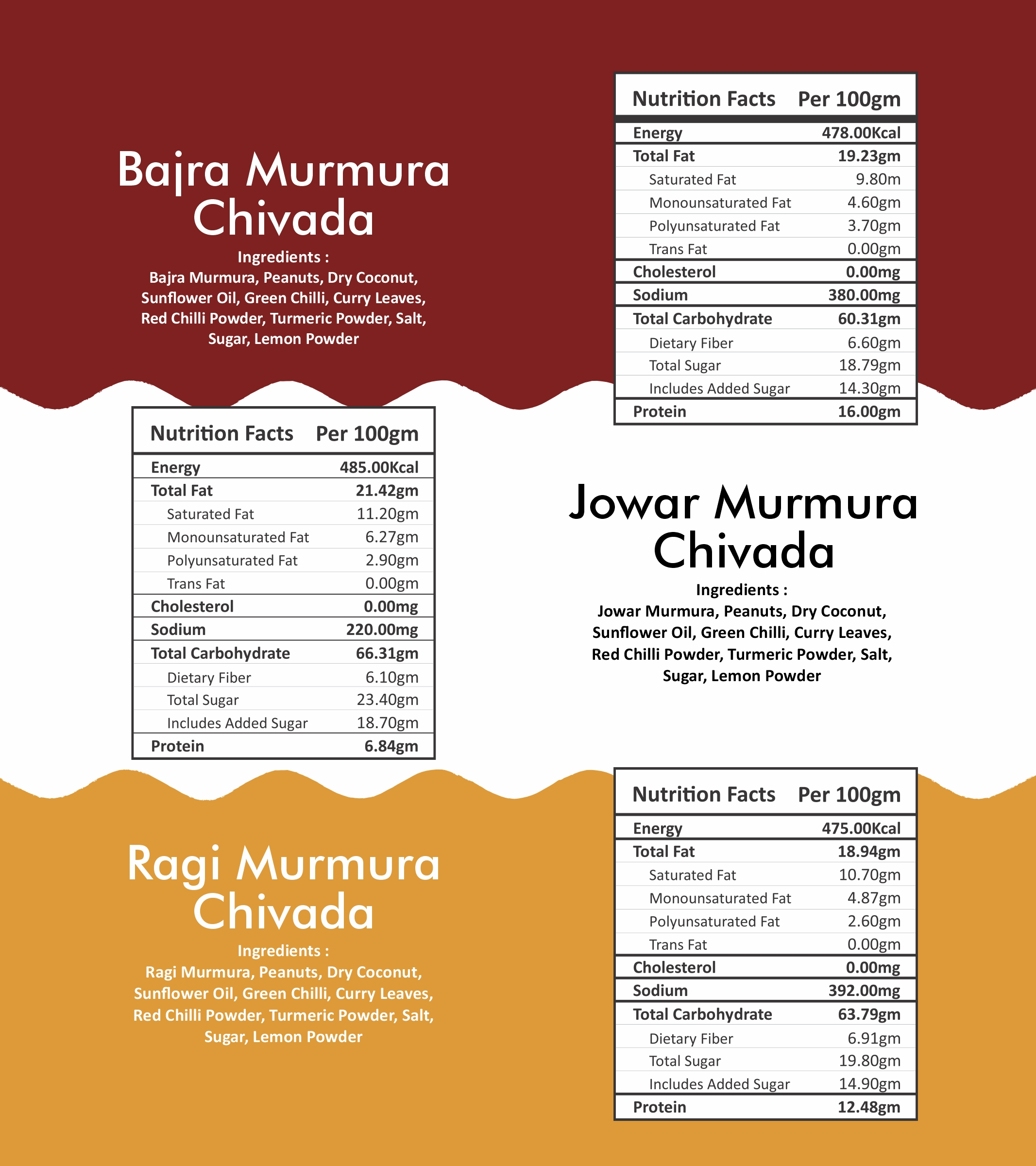 Bajra Murmura, Peanuts, Roasted Chana Dal, Dry Coconut, Sunflower Oil, Green Chilly, Curry Leaves, Red Chilli Powder, Turmeric Powder, Salt, Sugar, Lemon Powder
