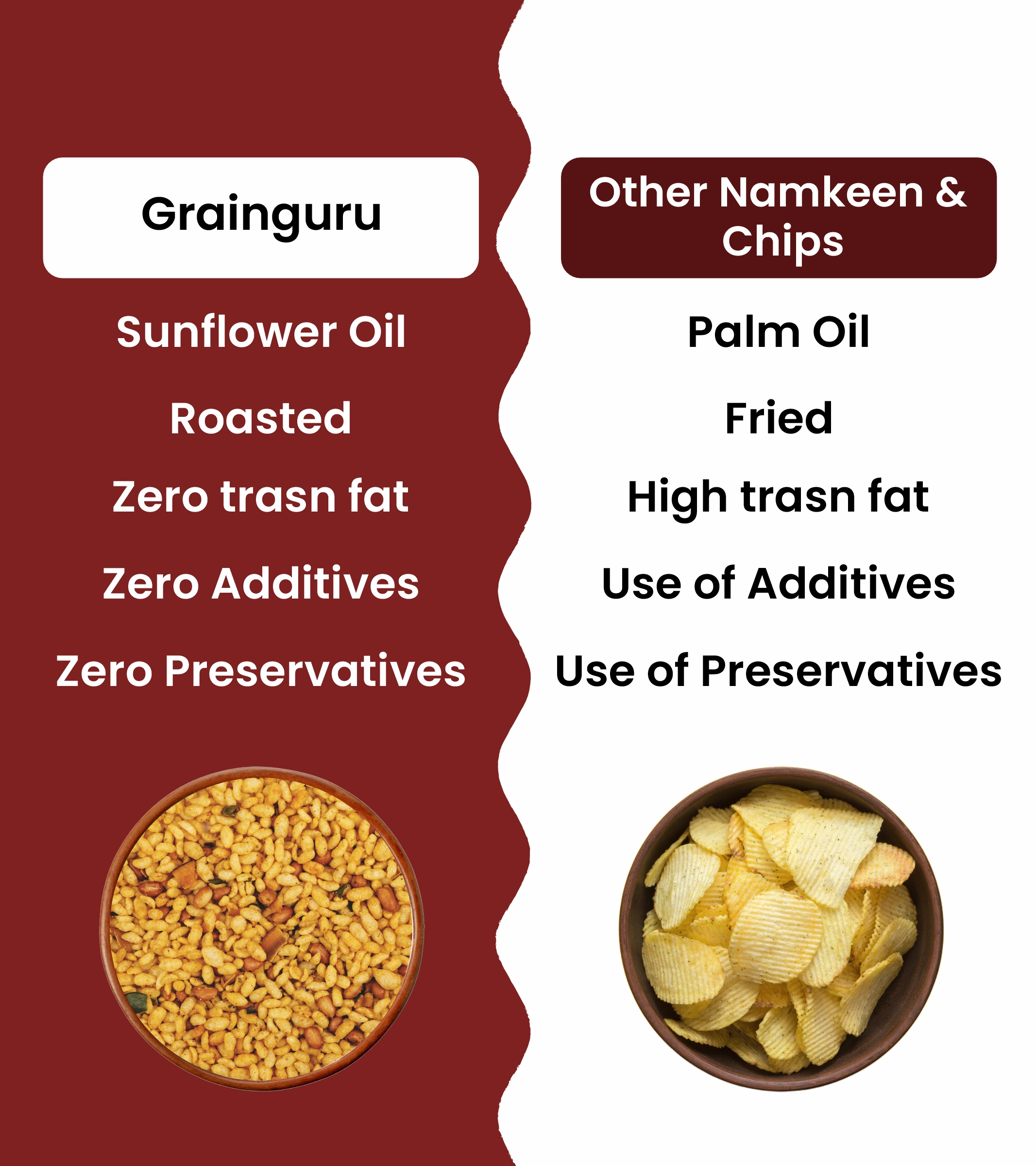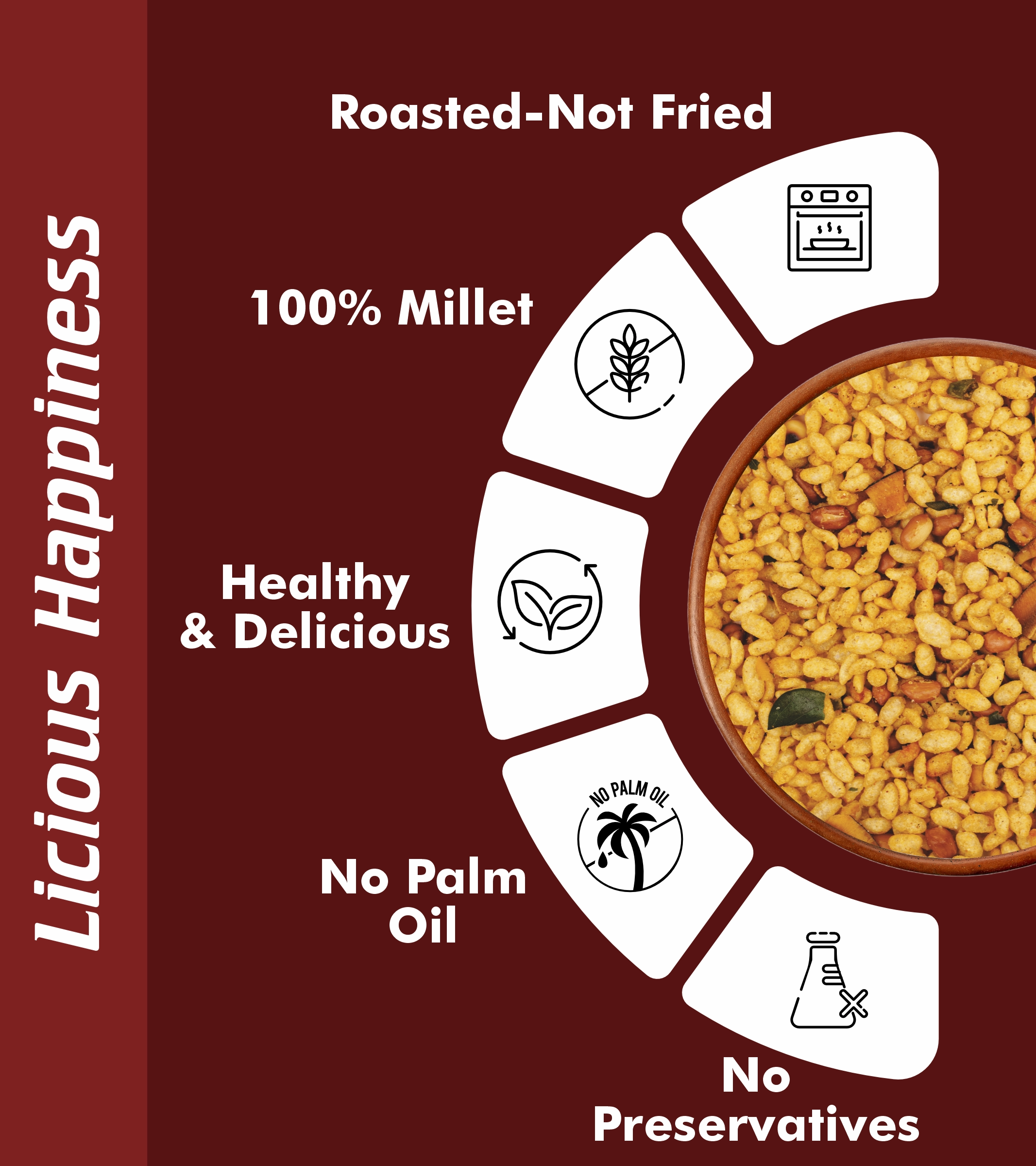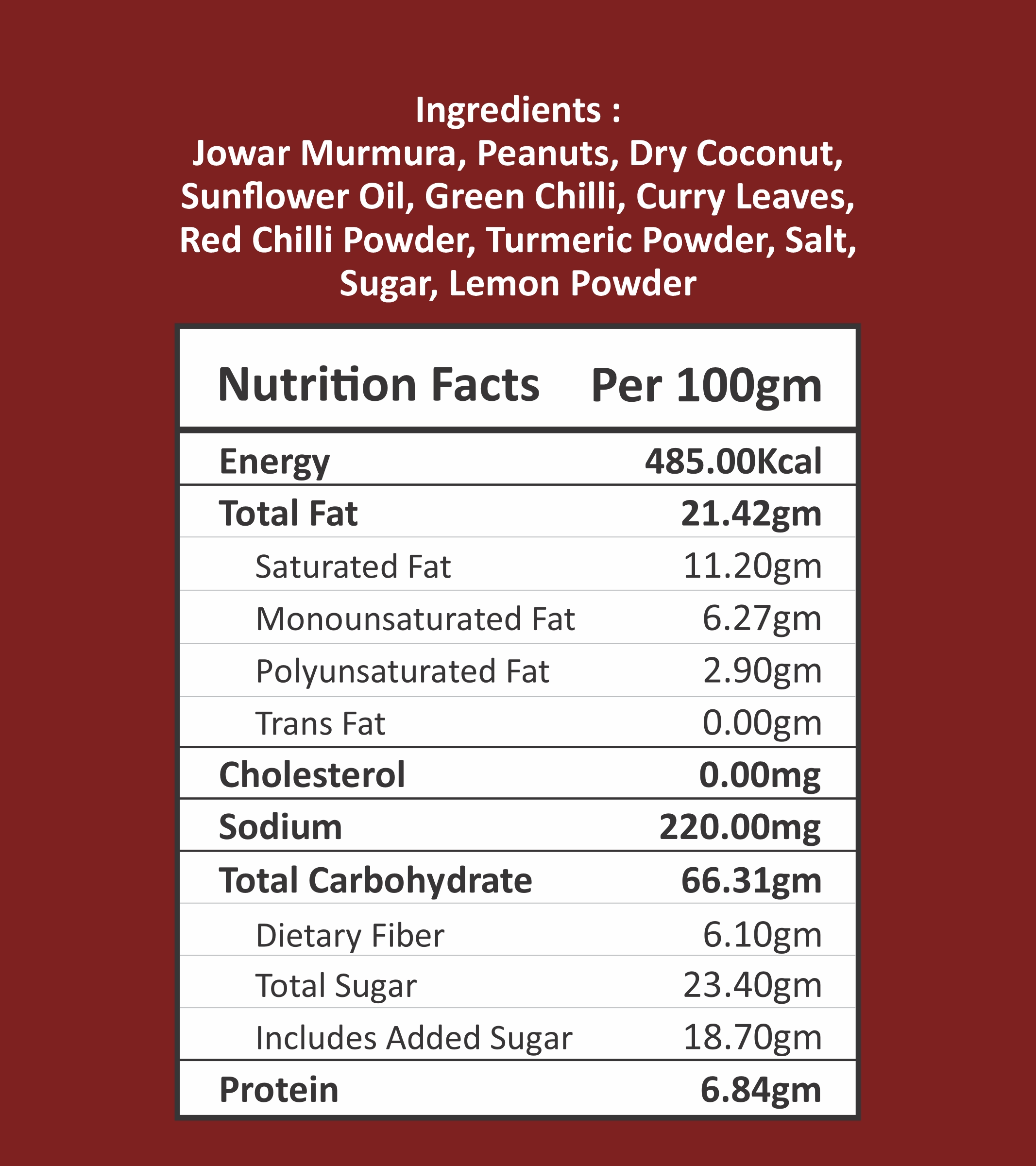 Jowar Murmura, Peanuts, Roasted Chana Dal, Dry Coconut, Sunflower Oil, Green Chilly, Curry Leaves, Red Chilli Powder, Turmeric Powder, Salt, Sugar, Lemon Powder