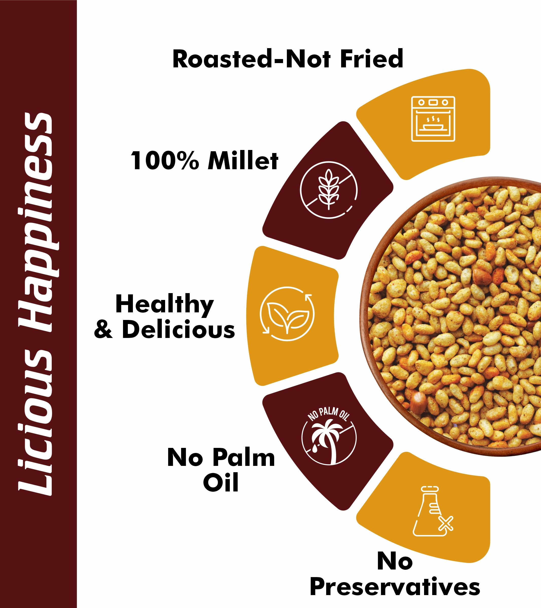 Ragi Murmura, Peanuts, Roasted Chana Dal, Dry Coconut, Sunflower Oil, Green Chilly, Curry Leaves, Red Chilli Powder, Turmeric Powder, Salt, Sugar, Lemon Powder