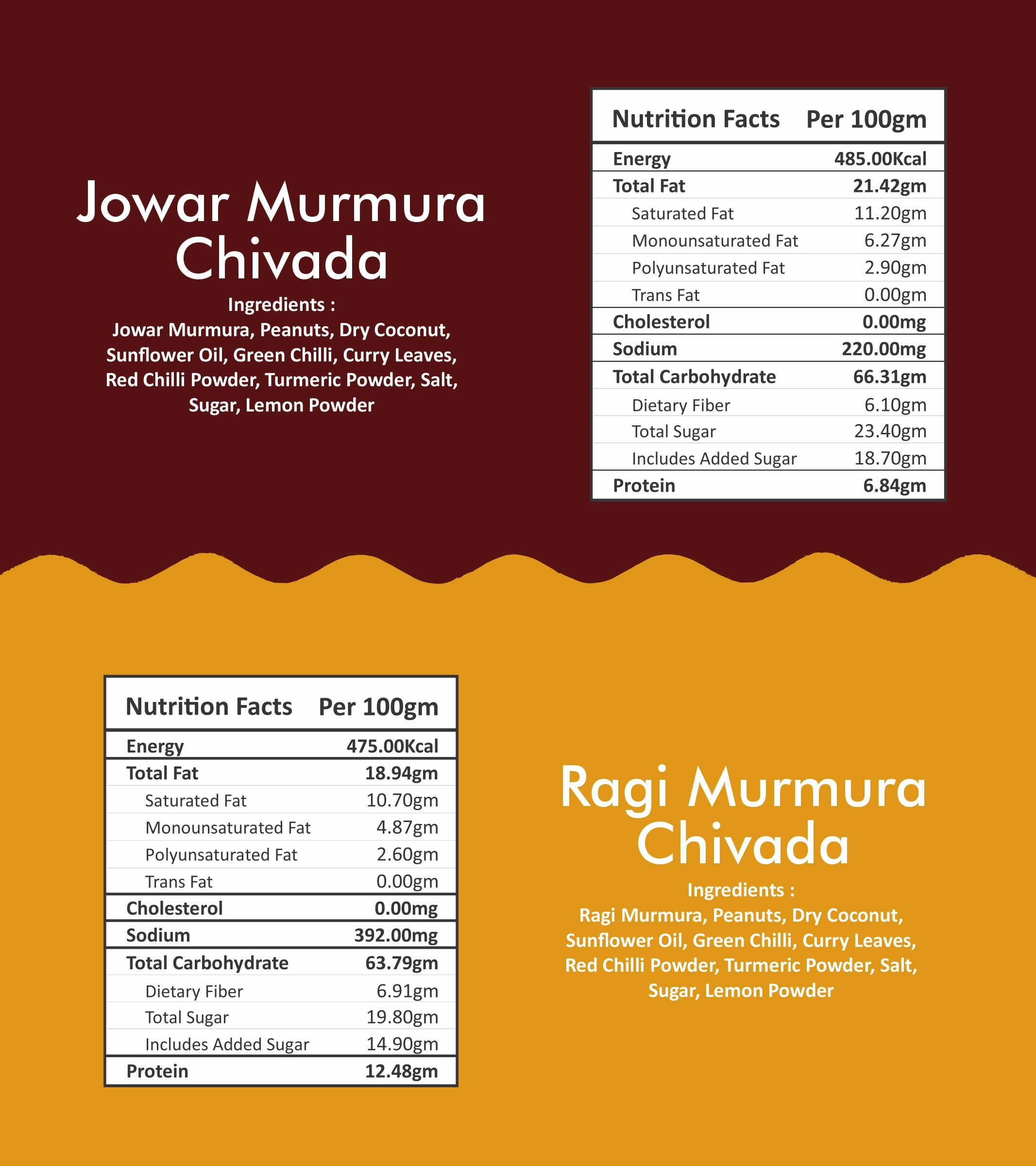 Jowar Murmura, Peanuts, Roasted Chana Dal, Dry Coconut, Sunflower Oil, Green Chilly, Curry Leaves, Red Chilli Powder, Turmeric Powder, Salt, Sugar, Lemon Powder